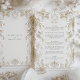 Mit dieser exquisiten Barock Elegance Wedding Menu Card stärken Sie sich beim Hochzeitsessen. Diese Karte besticht durch ein opulentes Design aus aufwändig geschnitzten Schnörkeln in reichen Elfenbein- und Goldtönen und strahlt Eleganz und zeitlosen Luxus aus. Die verzierten Details und die elegante Typografie machen diese Karte zu einer perfekten Wahl für eine feierliche Hochzeit. Die Vorderseite der Karte zeigt die Namen des Ehepaares in einem raffinierten Skript, während die Rückseite das Gourmet-Menü in einem Layout Kontur, das das aufwändige Design ergänzt. Diese Karte ist ideal für diejenigen, die eine Touch von Grandeur und klassischem Charme zu ihrer Hochzeitsfeier hinzufügen möchten.