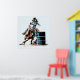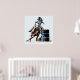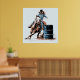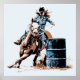 Pop Art Grafikbild in Braun, Blau und Schwarz eines Mädchens, das mit ihrem Pferd um ein Fass fliegt.