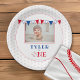Niedliche Baseball 1. Geburtstag Party Teller mit einem Foto / Niedliche Geburtstag Party Teller für ein 1. Geburtstag Party mit einem benutzerdefinierten Foto. Das Design hat ein Baseball und bunte Fahnen in rot, weiß und blau. Der Hintergrund hat ein Baseballmuster. Personalisieren Sie diese Geburtstagsserviette mit Kindername und Foto.