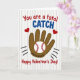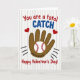 This greeting card centers on a brown baseball glove holding a white baseball with bright red stitching. Two red hearts sit on either side of the glove and ball, adding a clear touch of love to the sporty theme ❤️. The background is white with faint stripes that look like a baseball jersey. At the top, the text reads “You are a total CATCH” in a mix of red and blue letters that stand out easily. Near the bottom, “Happy Valentine’s Day!” appears in red lettering, placed beneath the main image. Small motion marks around the glove make it feel like the ball just landed in place, like a sweet little moment caught in action 💌🍫. It’s a fun, friendly way to say you care