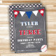 Niedliches Chalkboard Baseball 3. Geburtstag Einladung // Niedliche Baseball Geburtstagskarte zum 3. Geburtstag. Das Design hat ein großes Baseball und bunte Fahnen in Rot, Weiß und Blau auf dem Chalkboard-Hintergrund. Die Rückseite hat ein Baseballmuster. Personalisieren Sie diesen Geburtstag mit einem Kindernamen und personalisieren Sie alle Daten auf der Einladung. Toll als Party Einladung zum 3. Geburtstag für einen Jungen.