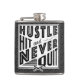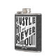 Baseball Hustle, Hit & Never Quit Hip Flask. Texte : Hustle, Hit And Never Quit, avec icône croisée de baseball et de battes softball.