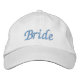 Weiße Baseballkappe mit blau besticktem Text. Passen Sie mit verschiedenen Farben oder Text!