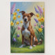 Ein fröhlicher Hund sitzt friedlich auf üppig grünem Gras, umgeben von bunten Frühlingsblüten unter einem weichen blauen Himmel. Dieses digitale Ölgemälde erfasst einen ruhigen Moment mit ausdrucksvollen Pinselstrichen, warmen Farben und einem Gefühl sanfter Freude.