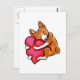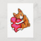 Aus Andies originaler Tinte und farbigen Bleistiften wird eine Subskription mit einem rot-weißen Basenji gezeigt, der ein herzförmiges Kissen zusammenpresst. c) 2014 Andie.