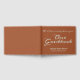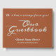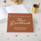 Dieses konservative Gästebuch enthält die Botschaften "Unser Gästebuch" und "Wir haben eine Nachricht von Ihnen Liebe!" sowie einen personalisierten Termin- und Veranstaltungsnamen. Der Text ist hellgrau und der Hintergrund ist sienna farbig. Ein allgemeines, individualisierbares Gästebuch wie dieses könnte bei einer Veranstaltung wie einer Wiedersehen, einer Geburtstagsparty, einer Babydusche oder einer anderen Veranstaltung verwendet werden.