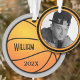 Fotovorlage Basketball Weihnachtsbaumschmuck. Grosses orangefarbenes Basketballbild mit zwei Textzeilen für den Namen und das Datum des Jahres. Füge das Foto eines Jungen oder Mädchens auf den Rücken. Dieses Ornament ist aus Acryl. Wir haben auch eine mit diesem Design in der Keramik.