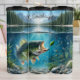 Dies ist eine detaillierte und realistische Abbildung, die in zwei Ansichten aufgeteilt ist: über und unter dem Wasser. Über dem Wasser ist ein ruhiger See umgeben von einem Wald aus Kiefern und Bergen unter einem hellen, sonnigen Himmel. Unter dem Wasser steht ein großer Bassfisch mit einem breiten Mund offen, der einen lebendigen grünen Angellure beißt. Die Unterwasserszene ist mit klarem, kristallklarem Wasser, glatten Steinen, verschiedenen aquatischen Pflanze und kleineren Fischen gefüllt. Das Sonnenlicht dringt ins Wasser ein und erzeugt eine atemberaubende und lebensechte Wirkung.
