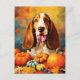 Ein farbiges Herbst- und Erntedank-Portrait eines Basset Hounds.