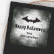 Glückliche Halloween-Aufkleber mit einer fliegenden FledermausSilhouette. Unten ist der Gruß "Happy Halloween" in einem gotischen Stil Schriftart und Name oder benutzerdefinierte Text auf einem dunklen, bedrückten Grunge Hintergrund.
