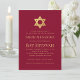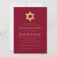 Eine einfache burgunderrote und goldene Bat-Mitzwa-Einladung, deren einziger Schmuck der goldene Folien-Davidsstern im oberen Teil (und auf der Rückseite) ist. Der gesamte Text ist in goldenen Großbuchstaben und kann bearbeitet werden. Der Hintergrund ist burgunderrot (tiefrot).
