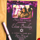 Cette invitation chatoyante violet et Bat mitzvah noir a de belles enveloppes assorties, des étiquettes de adresse de retour, et des cartes de remerciement. Choisissez entre les tailles et les styles de cette collection. Ce design Bat mitzvah moderne avec une étoile de david est parfait pour la célébration d'anniversaire de votre fille. Customisez facilement ce design pour votre diplôme, Quinceanera, ou faire-part de mariage! Ce design apporte une belle flamme aux couleurs violet, rose chaud, bordeaux ou prune.