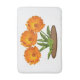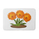 Orangefarbene Blume mit Tau auf den Blütenblättern. Grüne Stiele und Blätter sprießen aus braunem Bodenkreis.