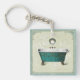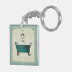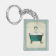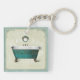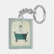 © Sue Schlabach/Apple sauvage. L'image montre un bain parisien vintage dans les tonalités blanches et bleues. Une baignoire bleue et blanche, un miroir démodé, et une frontière bleu-clair peuvent être vus sur l'image.