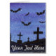 Un minuscule paysage aquarellé de chauves-souris en vol au-dessus d'un cimetière la nuit.