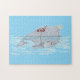 Eine skurrile Illustration eines großen Hornwal-Lebewesens mit Reißzähnen, einer Ankertätowierung auf seiner Flosse und einer Tätowierung, wie viele Schiffe er auf seinem Rücken versunken hat, mit einem Walreiter auf seinem Rücken, ist von sanften Wellen umgeben. Der Kontrast zwischen der riesigen Kreatur und dem winzigen Fahrer legt eine spielerische Erzählung nahe. Die gedämpften Farben und die einfachen Linien schaffen eine charmante und fantasievolle Szene.