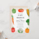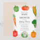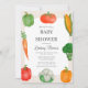 Ein niedlicher Bauer vermarktet Baby Dusche Einladung Vorlage. Das Design besticht durch handgemalte Aquarellgemüse auf hellbraunem Gingham-Hintergrund.