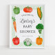 Ein niedlicher Bauer vermarktet ein grünes Babyduschenempfangsschild mit Plakat. Das Design besticht durch handgemalte Aquarellgemüse auf pastellgrünem Gingham-Hintergrund.