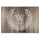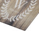 Bauernhausart-Glasschneidenbrett mit weißen Lorbeer über hölzernen Planken einer Scheune drucken Hintergrund. Er kennzeichnet personalisierten Familiennametext.