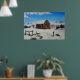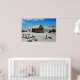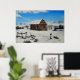 Drucken von Gemälden im Idaho-Haus. Schneeszene, Hütte in ländlicher Landschaft mit blauem Himmel.