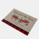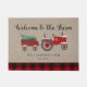 Bauernhaus Rot Kariert Personalisiert Mit Monogramm Doormat - eine Landgastmatte mit einem antiken, roten Bauerntraktor, der einen frisch geschnittenen Weihnachtsbaum und ein Geschenk trägt. Script Typografie liest - Willkommen auf dem Bauernhof und ist personalisiert mit Familienname und Jahr etabliert.