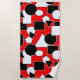 Dieses Strandtuch hat ein Bauhaus-Design aus Dreiecken, Kreisen, Rechtecken und Pentagonen in schwarz-weiß auf einem Feld von rot.