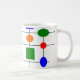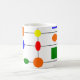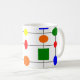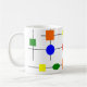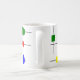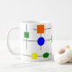 Diese Tasse hat ein Bauhaus-Design mit roten, gelben, orangefarbenen, grünen und blauen Formen.