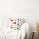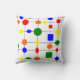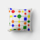 Dieses Kissen hat ein Bauhaus-Design mit roten, gelben, orangefarbenen, grünen und blauen Formen.