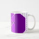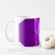 Diese Tasse hat ein Bauhaus-Design von überlappenden Hexagonen in lila Tönen auf einem Feld von weißen und gepunkteten lila Linien.