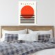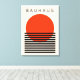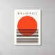 Modernes Kunstdesign im Bauhaus-Stil mit orangefarbener Sonne und schwarzen horizontalen Linien.