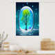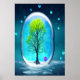 Ein Baum in einer Wasser- und Eisblase mit lila Ball im Hintergrund. Das ist eine künstlerische KI.