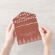 Bäume und Saitenleuchten auf Terrakotta fallen alle in einer Hochzeitseinladung. Weiße Bäume und Saitenleuchten in Terrakotta-Tonfarbe. Die Namen sind in der Skripttypografie, und der Riss von der RSVP-Karte kann gelöst werden.
