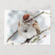 Auf dieser Postkarte befindet sich ein sehr kalter amerikanischer Baum-Sparrow, der auf einem Ast sitzt und bei einem Schneesturm mit blühendem Schneefräsen warm bleibe wird. Seine markante rote Kappe und sein Brustfleck bezeichnen ihn als diese Spattierart.