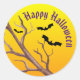 Vergnügen Halloween Sticker mit einem gekrönten Baumzweig, mit den Silhouetten von drei Fledermäusen, gegen einen gelben Vollmond. Der "Happy Halloween"-Text kann mit einem Namen, einem besondere Anlass oder einer Nachricht personalisiert werden.