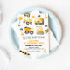 Bauwagen Geburtstagsparty mit Müllwagen, Kran, Vorsichtsschildern und orangefarbenen Töpfen.