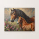 Ein herzzerwärmendes Gemälde mit einer Mare aus einer Bucht, das in einem lebendigen Feld von Wildblumen direkt neben ihrem Fohlen stehend ist. Die sanften Pinselstriche und die lebhaften Details zeichnen die zarte Verbindung zwischen den Pferden aus, das Set gegen eine ruhige und farbenfrohe Landschaft.