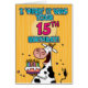 " Ich "lebe" es war Ihr 15. Geburtstag!" in Herden b-tägige Kuh des Spaßes, die eine Geburtstagskuchen-Grußkarte hält.