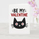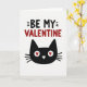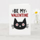 This card features a white background with the words “BE MY VALENTINE” placed near the top. “BE MY” is written in plain black letters, and “VALENTINE” appears just below it in bright red letters that stand out. The text is stacked in a simple vertical layout, making it easy to read at a glance. Near the bottom, there’s a black cat’s head shown as a smooth shape with small pointed ears. The cat looks straight ahead, and instead of normal eyes, it has two red heart shapes that feel sweet and love-filled 💘❤️. With only black, red, and white, the design stays focused on romance and a clear message. Share it with someone special and pass along a little extra love this Valentine’s Day 😘.
