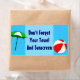 Un étiquette sur mesure avec des lettres bleues et l'art amusant de la plage ou de la piscine sur le thème d'une boule de plage rouge, parasol vert sur un arrière - plan bleu aquatique avec des vagues bouclées. Cette version dit "N'oubliez pas votre serviette et votre écran solaire" mais vous pouvez le changer à tout ce que vous voulez, ou supprimer pour un étiquette vierge. Cliquez sur Customiser pour modifier les polices, les éléments, la taille du étiquette, etc., et même enregistrer votre conception pour plus tard.