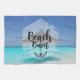 Ein Küchentuch mit einem tropischen Bild eines türkisfarbenen Meeres mit einem weißen Sandstrand und einem Single mit Strohschirm. Typografie sagt Beach Bum.