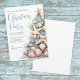 On the bottom right, a large Christmas tree made of beach shells, starfish, and coral adds a whimsical coastal touch, creating an overall teal blue and tan color palette that feels perfect for a laid-back holiday gathering.