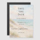 A watercolored sandy beach, sand dunes, ocean waves background. Personalize and add a date and your names. The text: Save the Date is written with a large trendy hand lettered style script.