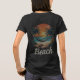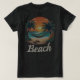 Eine Frau modelliert einen schwarzen T - Shirt mit einer Vintagen Grafik einer Sonnenuntergangsszene mit Palmen, einer Hängematte und Sandalen und dem Text "Beach Escape" unten.