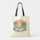 Eine Frau trägt einen hellen Totenbeutel mit einer Vintagen Grafik einer Sonnenuntergangsszene mit Palmen, einer Hängematte und Sandalen und dem Text "Beach Escape" unten.