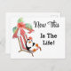 Eine Niedliche Grußkarte eines Pinguins, der auf einem Strandstuhl sitzt und die Worte, das ist das Leben