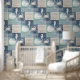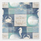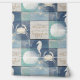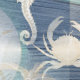 Vintage, in weiß und cremefarben gehaltene Bilder zum Thema Strand und Meer sind auf einem alten Holzboden mit quadratischem Aqua-Ton, einem tiefblauen und hellblauen und weichem Weiß angeordnet. Bilder in Creme und Weiß sind eine Krabbe, schwache Muscheln, Sand Dollar, Meerpferd und zwei in die Höhe schießende Seegügel zusammen mit den Worten "der Strand ist mein glücklicher Ort". Es handelt sich um eine großartige nautische Tapete zum Thema Strand und Meer.