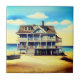Keramik Kachel in einer Abbildung eines idyllischen Strandhauses steht auf Pfählen gegenüber dem ruhigen Ozean, ein kleines Boot ruht auf dem Sandstrand. Der Himmel ist hell und teilweise bewölkt, was die ruhige Küstenatmosphäre noch verstärkt.