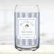Introducing our Beach House Blue Stripes Coastal Farmhouse Can Glass. Featuring watercolor illustration of orchid and dried palm leaves with navy blue strips as background. Suitable for Rental vacation beach house or coastal cottage.