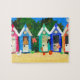 Ein Puzzle mit einer Reihe farbenfroher Strandhütten und Möwen, aus einer handbemalten Papierkollektion von Judy Adamson. Andere Produkte und Grußkarten mit diesem Design sind in meinem Shop erhältlich.