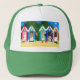 Ein Hut im grünen und weißen LKW-Stil, der mit einer handbemalten Collage aus Strandhütten geschmückt ist.